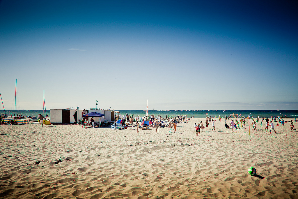 Warnemünde erstreckt sich nach Westen von der Rostocker Hafeneinfahrt. Es verfügt über einen sehr breiten Sandstrand, nur im Westen vor der Steilküste gesellen sich einige Steine dazu, im Wasser liegen dort teilweise große Findlinge.