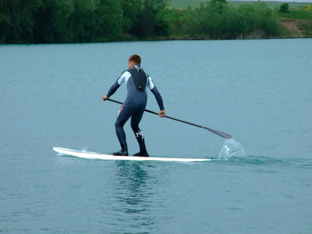 Da es ein Kiesgewässer ist, sind Schuhe empfehlenswert. Im Sommer Boardshort, Lycra und Sonnenschutz, sonst je nach Jahreszeit mit Neoprenanzug.